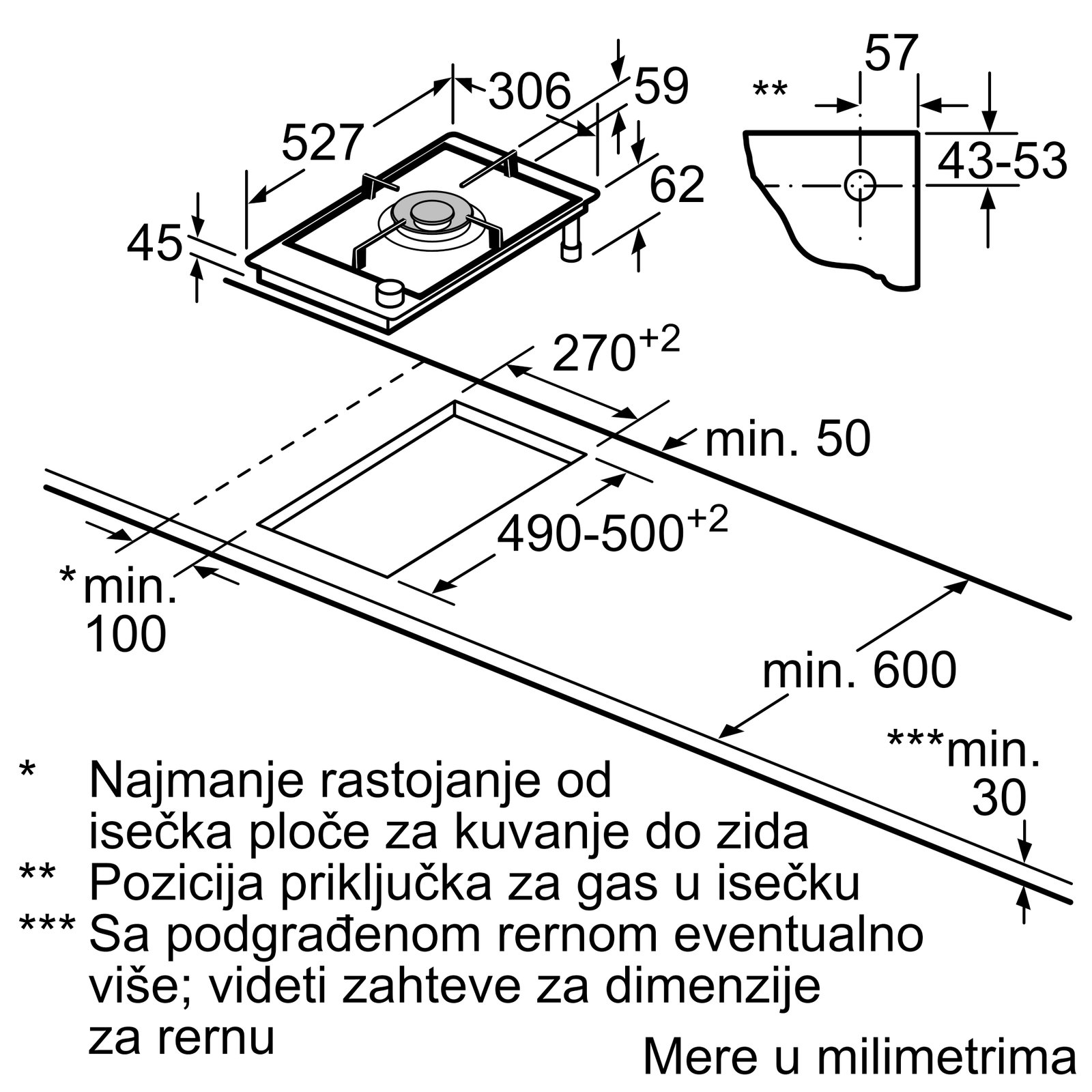 Serija 8, Domino plinska ploča za kuvanje, 30 cm, na keramici, Crna, PRA3A6I10